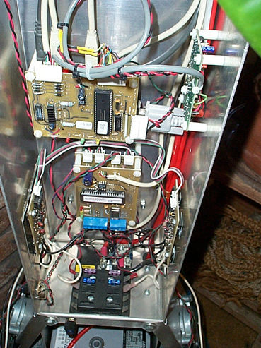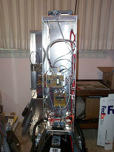 2001 This year we developed "Bertha" our most advanced mobile service robot. "She" had an LED face with pan/tilt for the video camera embedded in her head. She was featured once in a Channel 46 newscast. As you can see, we were still running "brains off board" and experimenting with adding vacuuming capability.