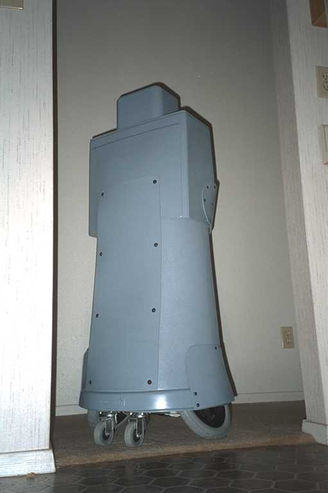2003 With a low cost Toshiba laptop on board, we start demonstrating publicly at places like coin shops, department stores, etc. We also got our first, commercially leased lab space in Conyers, GA. We called "garbage can" shrouded CareBot™ "Emily" after the wife of our then Chairman of the Board, Edmond L. Lamb.